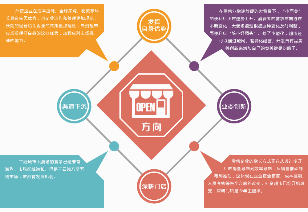 盡管外資超市在華發(fā)展遇到“水土不服”瓶頸,但是外資超市的發(fā)展信心并沒有降低。從過去盲目比拼市場擴張到追求門店質(zhì)量提升,未來,新開門店將不再成為考量企業(yè)的單一標準,優(yōu)化門店和完善產(chǎn)業(yè)鏈結(jié)構(gòu)成為今年業(yè)界的主流工作。斥巨資改造門店,加大門店管理力度,外資零售企業(yè)通過各種調(diào)整,改變過去的急速擴張,準備在中國市場重振雄風。