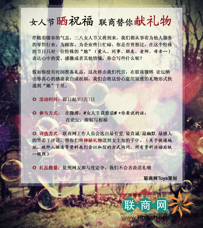 在此小T.以及聯(lián)商網(wǎng)編輯部所有同事們感謝大家的參與及回復(fù),無論什么節(jié)日,聯(lián)商網(wǎng)但愿所有真摯的網(wǎng)友都能事事順心、身體健康、家庭美滿。