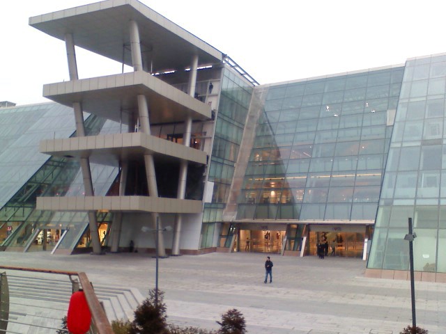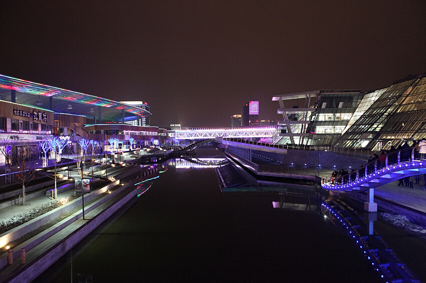 北門是整個(gè)商業(yè)地產(chǎn)項(xiàng)目繁華的沿河步行區(qū),南門前是大片的工地和草坪,比較荒蕪沒拍。