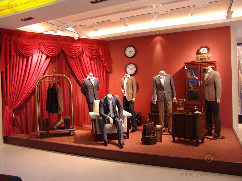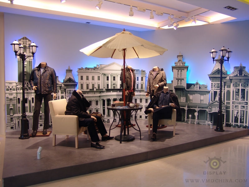 使顧客感到精美或身臨其境的陳列,沒有特雖的藝術道具,只是將男人的著裝功能與場合完美的結合起來,讓顧客也有“原來我需要的整是這樣的著裝啊”的想法。舞臺櫥窗使顧客很快聯(lián)想到自己的生活。