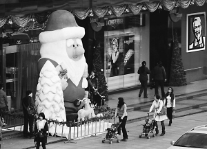昨日,武昌武商亞貿(mào)廣場前,一個近5米高的“圣誕老人”憨態(tài)可掬地站在路邊,右手還揣著一份“圣誕禮物”,吸引不少過往市民的眼球。距圣誕節(jié)還有一個月,不少商家提前營造氣氛,為圣誕節(jié)促銷造勢。