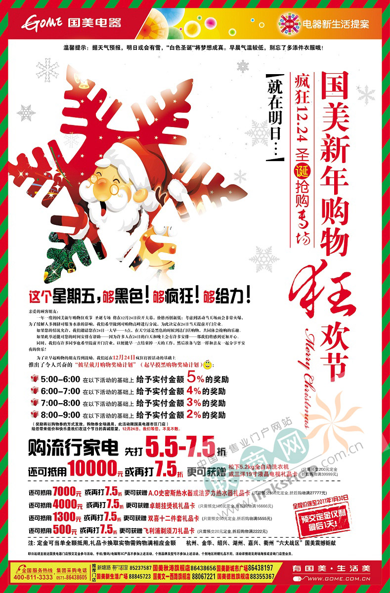 據(jù)了解,浙江國美電器在此次圣誕節(jié)之際,就集結(jié)了百余廠商,采集了300余款與圣誕節(jié)相關(guān)的家電產(chǎn)品,包括時下熱銷的平板電視、冰箱、洗衣機、廚電、空調(diào)、數(shù)碼品類等,將以超低“圣誕價”來迎合消費需求,并采集了圣誕專供贈品,來供應(yīng)圣誕市場。