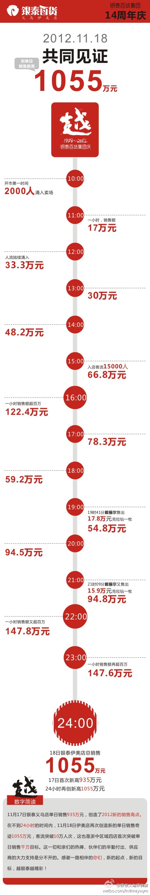 “不用錢的嗎?這么多人!”這幾天,在銀泰義烏伊美店,經(jīng)常能看到一些顧客一邊抱怨著,一邊扎進(jìn)人堆里搶購(gòu)。銀泰百貨集團(tuán)慶期間,促銷力度空前,有的折扣低至1.5折,引爆了義烏市民的消費(fèi)熱情。4天時(shí)間,義烏及部分周邊縣市的市民,在銀泰義烏伊美店花了3200多萬元,各大專柜幾乎每天都在補(bǔ)貨,導(dǎo)購(gòu)增加了一倍,專柜店長(zhǎng)和品牌商都到現(xiàn)場(chǎng)幫忙,還是忙不過來。 。▉碓矗赫阒行聢(bào) 記者:俞萍)  圖為:義烏銀泰百貨官方微博截圖。 【義烏銀泰百貨店慶單日銷售達(dá)1055萬】據(jù)悉,義烏銀泰百貨在不到24小時(shí)的時(shí)間內(nèi),11月18日銀泰伊美店再次創(chuàng)造新的單日銷售奇跡1055萬,成交率曾高達(dá)71 %,客流突破10萬人次,這也是浙中區(qū)域四店首次突破單日銷售千萬目標(biāo)。 --------------------------------------------------- ------《來自戳戳星球的一顆小戳妮》------