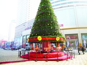 12月23日,記者在重慶路上一家商場(chǎng)門前,看有一棵造型新穎的圣誕樹,它高約12米,直徑約8米,底部逆時(shí)針旋轉(zhuǎn),同時(shí)伴有8匹馬可升降,旋轉(zhuǎn)一次時(shí)間大約5分鐘,由保安遙控操作啟動(dòng),圣誕樹是商場(chǎng)特意為迎圣誕節(jié)而制作的。