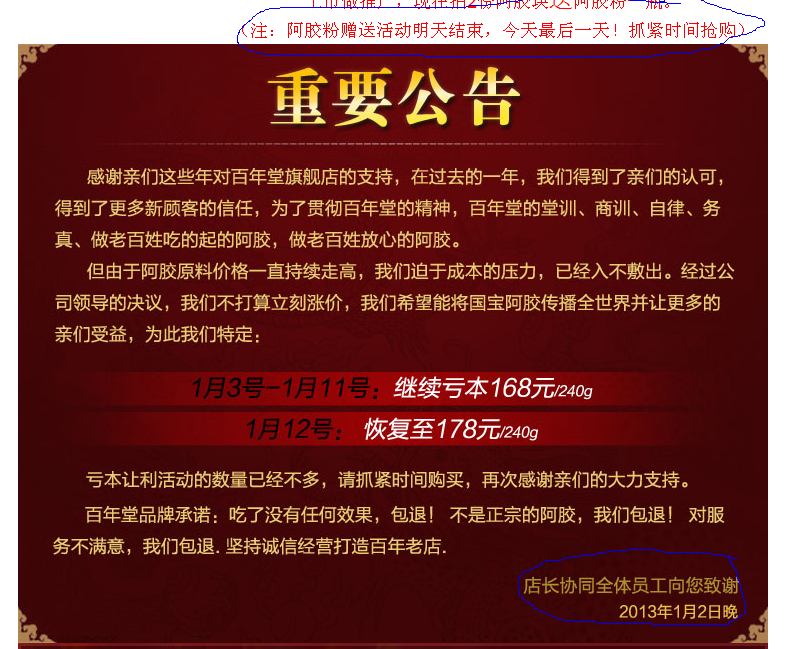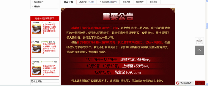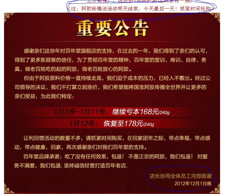 2、百年堂促銷欺詐:嚴重違反《零售商促銷行為管理辦法》第11條:“零售商開展促銷活動,不得利用虛構(gòu)原價打折或者使人誤解的標價形式或價格手段欺騙、誘導(dǎo)消費者購買商品”!1、垃圾阿膠百年堂詐騙公司在天貓有四家官方商城,“東阿百年堂阿膠銷售有限公司”,“東阿百年堂阿膠銷售有限公司武漢分公司”,“武漢聚寶盆電子商務(wù)有限公司” “武漢藏金閣電子商務(wù)有限公司“。從他們的注冊地址和發(fā)貨地址可以看出,就是被同一人控制,如果是實體連鎖店,那是正常的,但是同時出現(xiàn)在同一家天貓商城同一個網(wǎng)頁上,就涉嫌互相串通價格,欺瞞顧客!欺詐可想而知。只要你買所謂百年堂牌阿膠,就會掉入他們精心編制的陷阱。2、促銷宣傳更是赤裸裸的欺詐,價格是天天宣傳今天是最低價,明天就漲價。贈送機會今天永遠是最后一天,明天就沒有了!不斷的誘導(dǎo)你上當進行購買!典型的促銷欺詐。