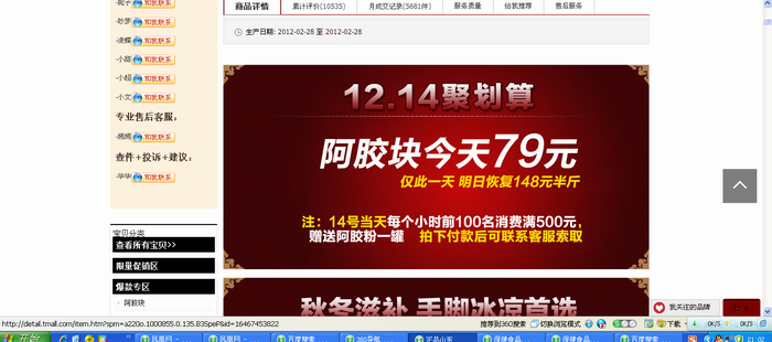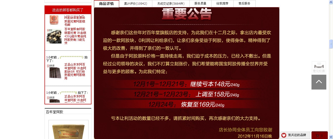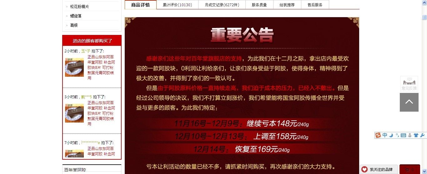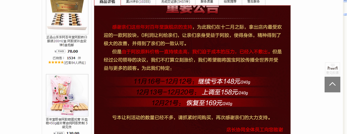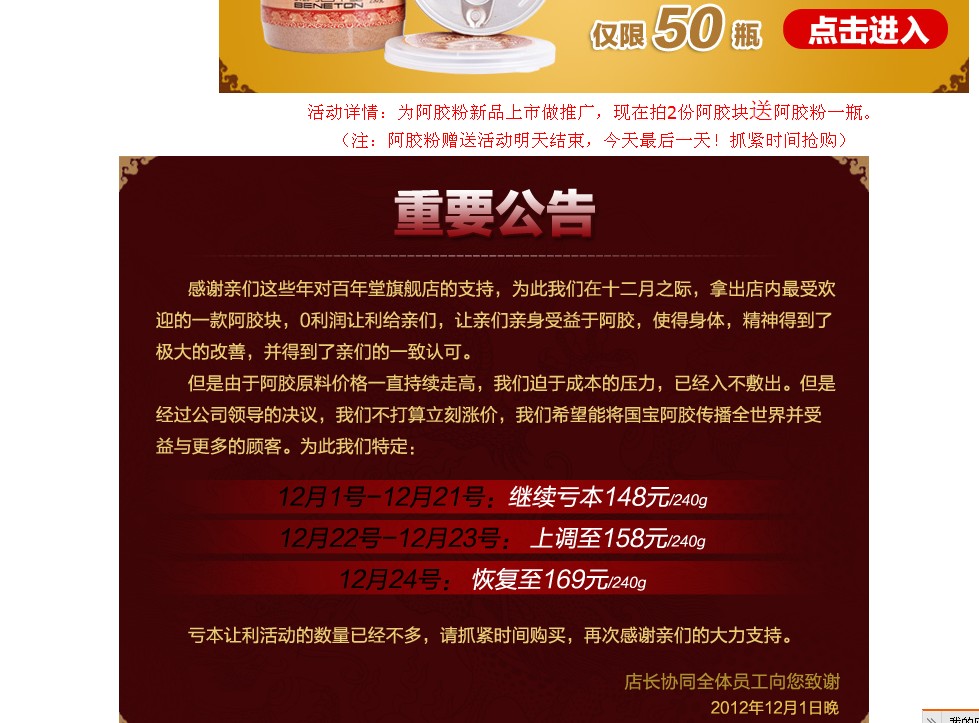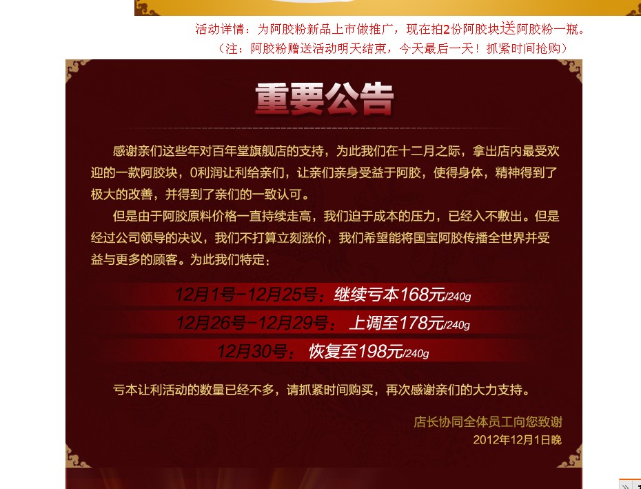 12月8準備買阿膠,上淘寶網(wǎng)搜索。一家淘寶百年堂阿膠旗艦店的一款240克的阿膠塊吸引了我,尤其他宣傳公告12月8日148元的優(yōu)惠活動是最后一天了,我立即下單購買。但接下來的幾天,其價格依然是148元,促銷時間依然是最后一天,更可氣的是12月14日,又直接降到了79元,促銷欺詐呀!天天活動是最后一天。這種企業(yè)有沒有良心呀!而且買回來的根本不是什么“百年堂”牌而是什么“阿輝”牌。