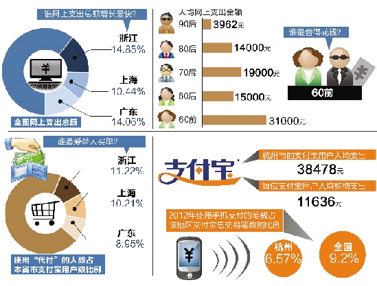 在這份賬單上,記者看到,浙江人在網(wǎng)上消費(fèi)榜首“爭奪戰(zhàn)”中首次超過廣東;杭州人均支出位居全國第二,達(dá)到38000多元。