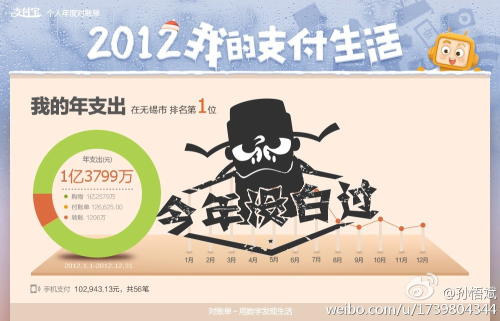 無錫一淘寶網(wǎng)友支付寶年支出1.3799億元 支付寶近期推出年度對賬單活動,上周,一位網(wǎng)友在微博上曬出了自己的對賬單,自稱“支付寶年支出941萬排名無錫26位”,一下子引來眾網(wǎng)友圍觀。緊接著,網(wǎng)友“@JACK的哥哥”在新浪微博上貼出“年支出1億3799萬,無錫市排名第1位”的對賬單,徹底震翻了眾人。