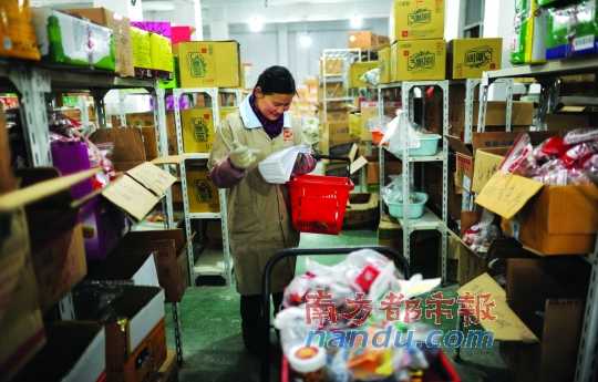 配貨員提籃穿梭于各種食品的貨架之間。抄底年貨并非所有商品都適合網(wǎng)上購買。