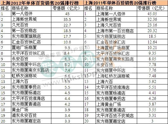 歸總得出,在20強榜單中,12家位于市中心的百貨銷售額排名下跌,2家市中心百貨排名上升,2家中環(huán)百貨上升,4家郊區(qū)百貨上升。其中值得注意的是,上榜的百貨店并不都是老面孔,浦東永安百貨2012年首次進(jìn)入前二十強榜單,不過在2012年浦東永安百貨由百貨轉(zhuǎn)為黃金珠寶專業(yè)賣場,黃金單價高,這可能也是浦東永安百貨能進(jìn)入20強榜單的原因之一。