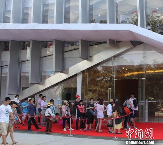 三亞市內(nèi)免稅店新增3000平方米的擴(kuò)建區(qū)域于2月10日起正式對(duì)外營(yíng)業(yè)。今年春節(jié)是海南離島免稅政策調(diào)整提高購(gòu)物額度后的首個(gè)黃金周,吸引許多游客前往。圖為游客在店門外排隊(duì)等候進(jìn)店。 。▉碓矗褐袊(guó)新聞網(wǎng))