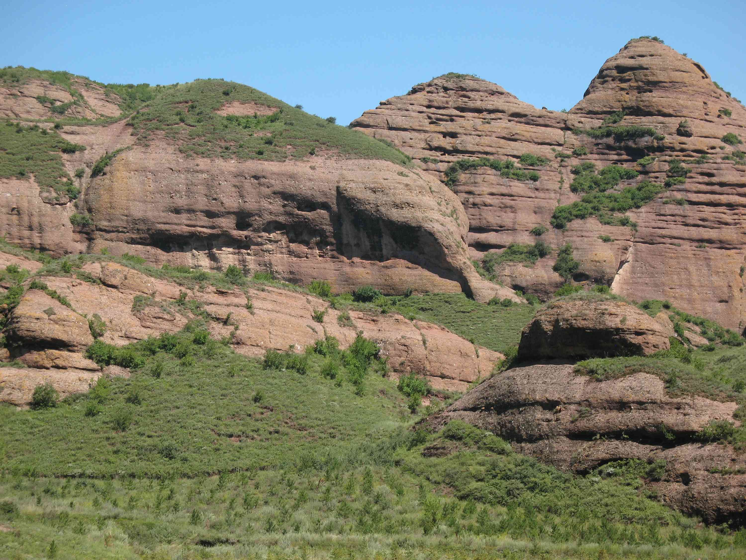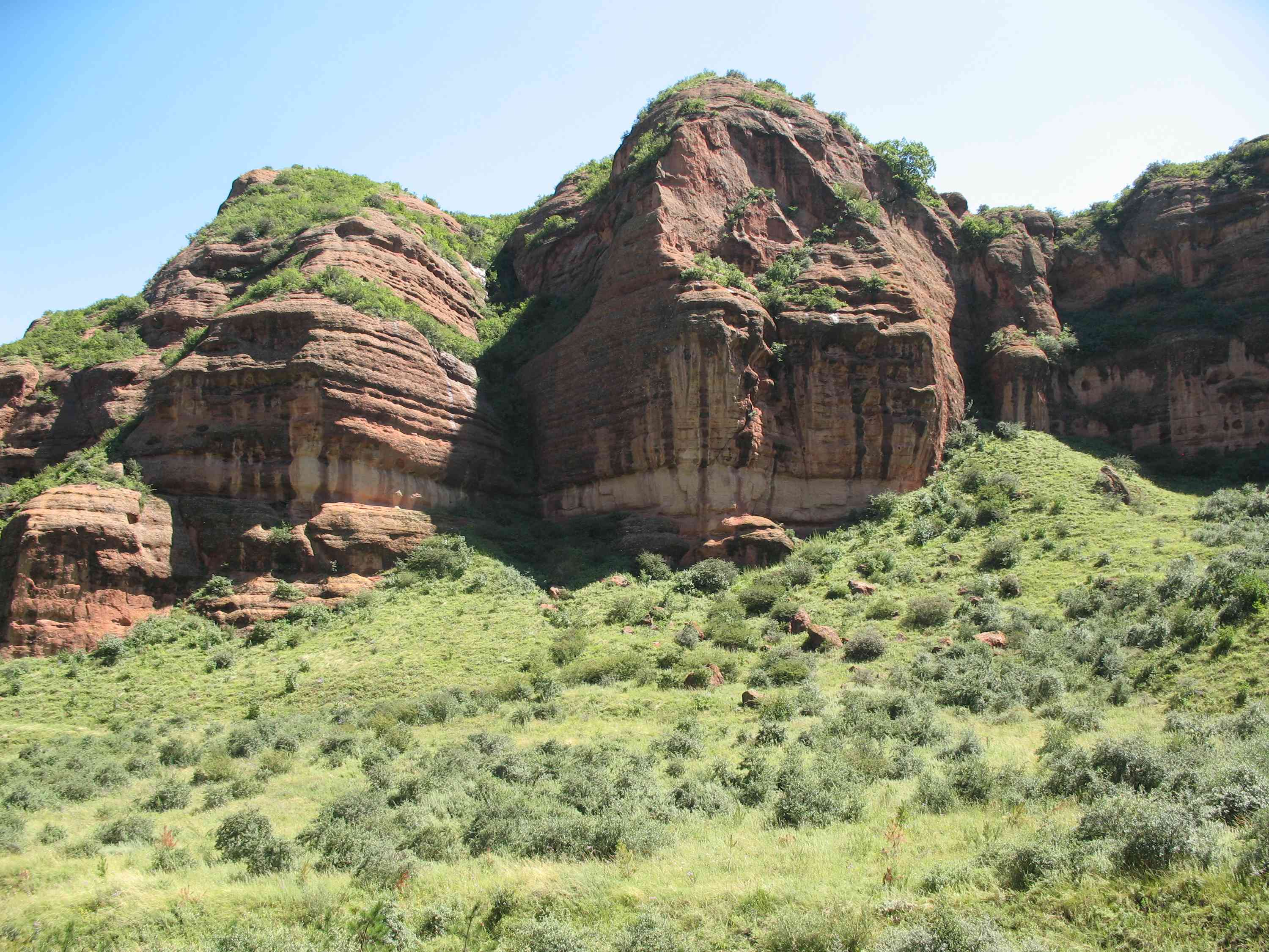 固原火石寨,在寧夏南部的西吉縣境內,由于它的山巒呈現(xiàn)暗紅色,尤其在綠樹的掩映下,如同一團團燃燒的火焰,因而取名固原火石寨。每當春夏時節(jié),滿山遍野花草叢生,色彩斑斕,蜂戀蝶舞,生機盎然。在稀疏的林木間,還生長著一簇簇箭竹,為北方山水增添幾分南國姿色。在固原火石寨方圓百里之內,分布著許多大大小小的兀立山峰,其中著名的有掃竹嶺、石寺山、照壁山等,尤以天然石城最為奇特。