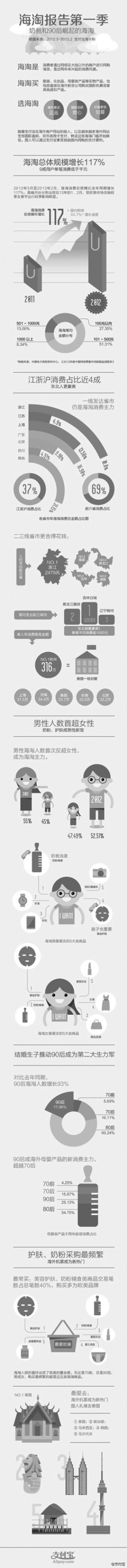 4月9日,支付寶發(fā)布了2012“海淘”用戶消費(fèi)數(shù)據(jù):2012年,中國(guó)境內(nèi)消費(fèi)者通過(guò)支付寶“海淘”消費(fèi)的規(guī)模同比增長(zhǎng)117%,高于國(guó)內(nèi)網(wǎng)購(gòu)64.7%的增長(zhǎng)速度。而“海淘”消費(fèi)中,奶粉、輔食等嬰幼兒食品類(lèi)的交易占總體近四分之一,成為“海淘”最火爆的消費(fèi)品,對(duì)國(guó)貨不滿是“海淘”崛起的最主要原因。