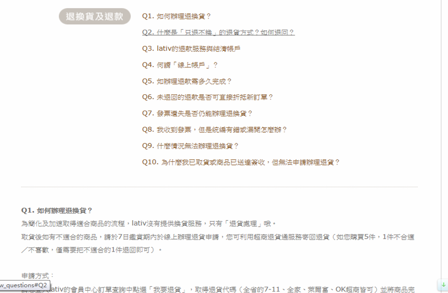 圖-1:Lativ的退換貨頁面索引
