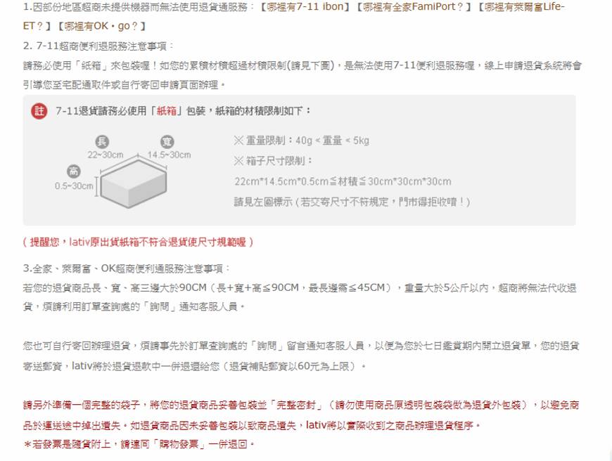 圖-2:Lativ的退貨紙箱規(guī)格要求(7-11、全家、萊爾富、OK超商便利渠道)