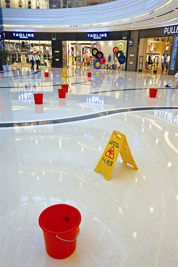 近日,有多位網友爆料,龍灣萬達廣場漏雨嚴重。網友“幸福微甜Vivi”說:“萬達擺水桶陣,里面下小雨了。”網友“皓宏電鍍”也在自己的微博上發(fā)出了多張萬達廣場漏雨的照片。龍灣萬達廣場開業(yè)還不滿一年,商場為何會出現(xiàn)漏雨的現(xiàn)象?昨天,記者來到現(xiàn)場,探詢其中的答案。