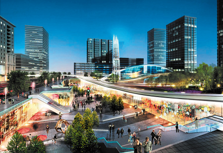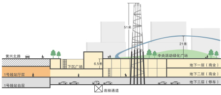 而休閑廣場中將有一個巨大的下沉廣場作為地上與地下的銜接,地面上的市民也可以通過自動扶梯進入地下廣場。