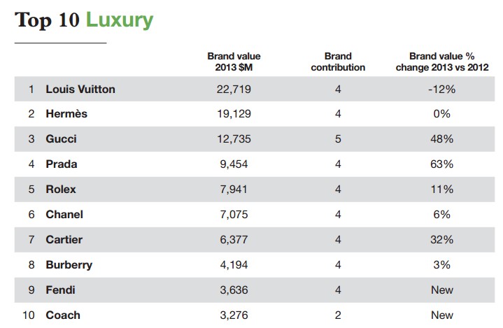 奢侈品牌中排名第五至第十的依次是:勞力士、香奈兒、卡地亞、博柏利(舊譯巴寶莉)、芬迪和蔻馳。
