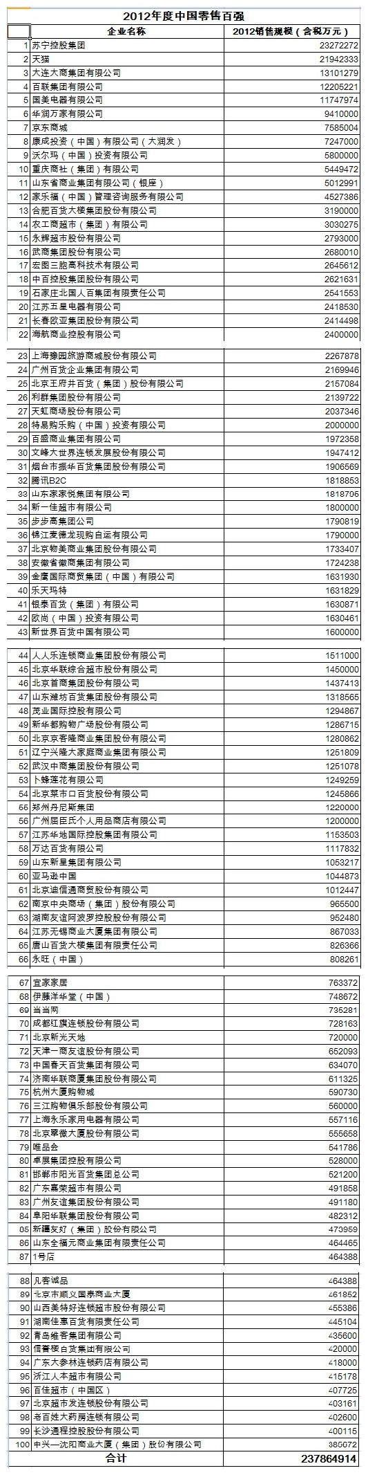 中華全國商業(yè)信息中心統(tǒng)計(jì)數(shù)據(jù)顯示,2012年我國零售百強(qiáng)企業(yè)中,前十名企業(yè)銷售額合計(jì)為11776.1億元,占百強(qiáng)整體銷售規(guī)模的比重為49.5%,比2011年提升1.2個(gè)百分點(diǎn),是2007年以來的最高占比。