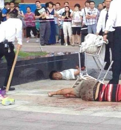 記者發(fā)現(xiàn)在廣場南側(cè)的青年路口也有一名男子倒在血泊之中,大約有60歲左右,頭發(fā)花白,頸部有一個約5厘米的傷口,上身滿是血跡。民警趕到后將男子用白布蓋上,并送入警車。