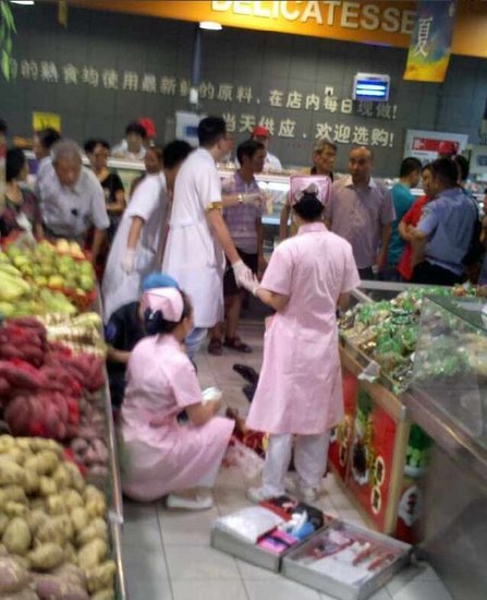 一位目擊證人告訴記者,事發(fā)時(shí)間大概是10點(diǎn)多,當(dāng)時(shí)老伯正購(gòu)買(mǎi)豬肉,向一員工索要塑料購(gòu)物袋,但該員工認(rèn)為老人想多拿塑料袋,雙方就起了口角沖突,該名員工立刻拿刀捅向老伯,老伯中刀倒地,周?chē)念櫩鸵?jiàn)此情景,四散逃開(kāi),見(jiàn)行兇者手持利刃,無(wú)人敢上前。“有位老依姆,看到這樣的情景,哇地大喊一聲,奪路就跑。”目擊者說(shuō)。