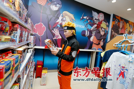 走進(jìn)位于中山東一路的“火影忍者”主題店,動(dòng)漫元素隨處可見。貨架上擺著錢夾、文件夾、眼罩等正版的火影周邊產(chǎn)品,冷柜和墻壁上貼著大幅的火影人物肖像,頭頂?shù)碾娨暡シ胖炼咕W(wǎng)上的火影動(dòng)畫,還有火影人物的角色扮演者(Coser)往來穿梭,吸引了很多消費(fèi)者與之合影。