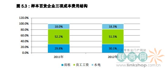 2012 年,三項費用總體增加16.2%,其中水電增幅最高,為18.6%。百貨店的第一費用仍然是員工工資,其次是房租和水電。人工工資連續(xù)三年成為百貨店第一費用,員工工資的增長速度遠快于員工數(shù)量的增長。企業(yè)面臨較大的人工費用和租金成本壓力。