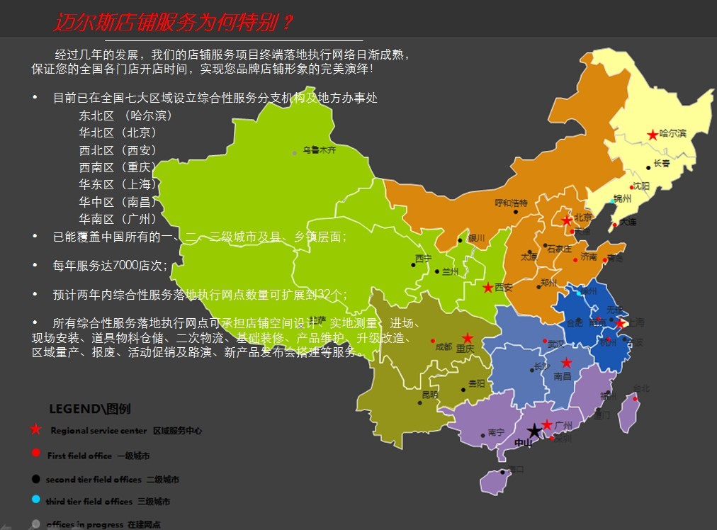 MYERS有自己的專業(yè)空間設(shè)計(jì)公司,5萬平米的展柜家私生產(chǎn)制造工廠,7大區(qū)域服務(wù)中心,218家建店服務(wù)商,渠道服務(wù)網(wǎng)絡(luò)覆蓋面的廣泛及滲透力,是我們MYERS具備極強(qiáng)的終端建店快速反應(yīng)能力。