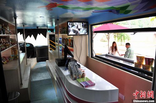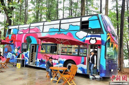 9月6日,一輛由人工打造的雙層巴士造型的便利店亮相武漢東湖邊,吸引不少在東湖游玩的游客們前來光顧。據(jù)店主介紹該便利店并不是由公交車改造,而是自己和朋友們花了近1年多的時間純?nèi)斯ご蛟斐鰜淼墓卉嚹P。在東湖生態(tài)旅游風(fēng)景區(qū)管委會幫助下,小店通了水電,甚至還配好了wifi,準(zhǔn)備10月份開業(yè),將為東湖景區(qū)增添個性新景觀。 (中新社 張暢 攝)
