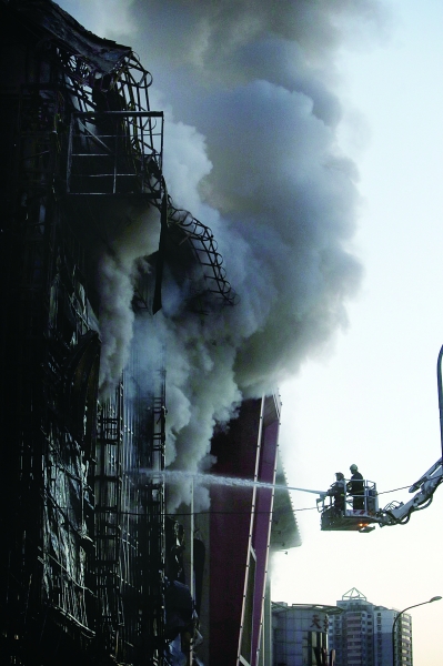 今天早上5時許,離著起火現(xiàn)場還有一公里時,已經能看到天空中翻騰而起的滾滾濃煙。到了蘋果園南路北側的喜隆多商場前,只見黑煙持續(xù)不斷地從商場西側由里往外冒,消防員登上云梯進行撲救。