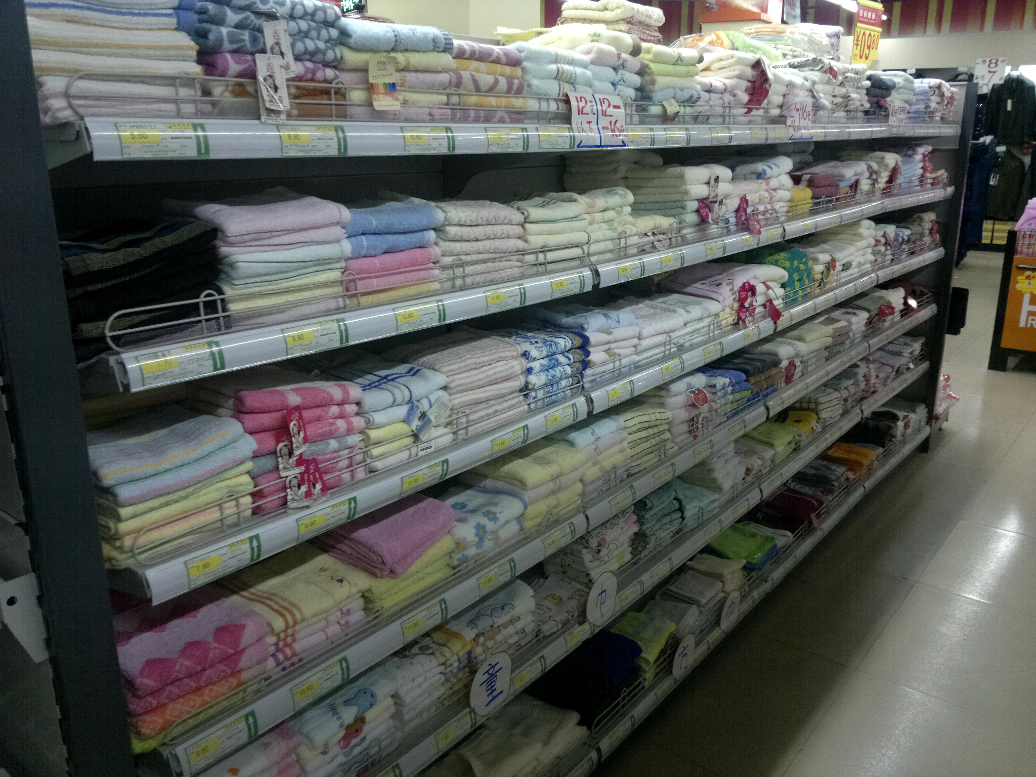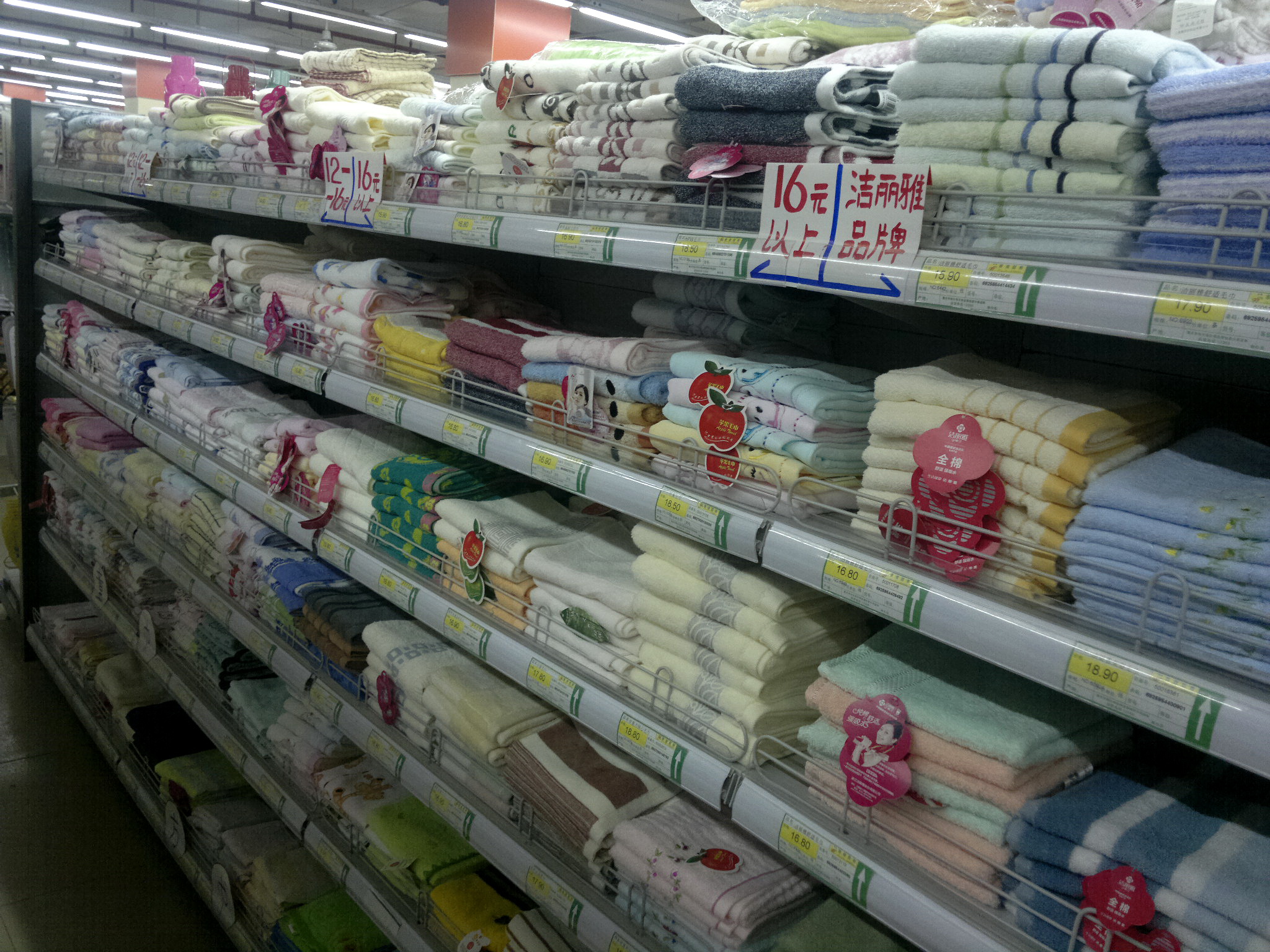 毛巾這個類別對于我們這種的超市的量不是很大,但是毛巾在鄉(xiāng)鎮(zhèn)市場卻是個批發(fā)大于零售的商品,白市驛鎮(zhèn)很多年前就有金號和潔麗雅的專賣店,農(nóng)貿(mào)市場的毛巾店更多,因為毛巾是廣大鄉(xiāng)鎮(zhèn)農(nóng)村老年人過壽擺宴的首選待客禮品,加上其他各種方式送的毛巾,常住居民幾乎每個人每年都會收到毛巾,因此零售市場反而不大。