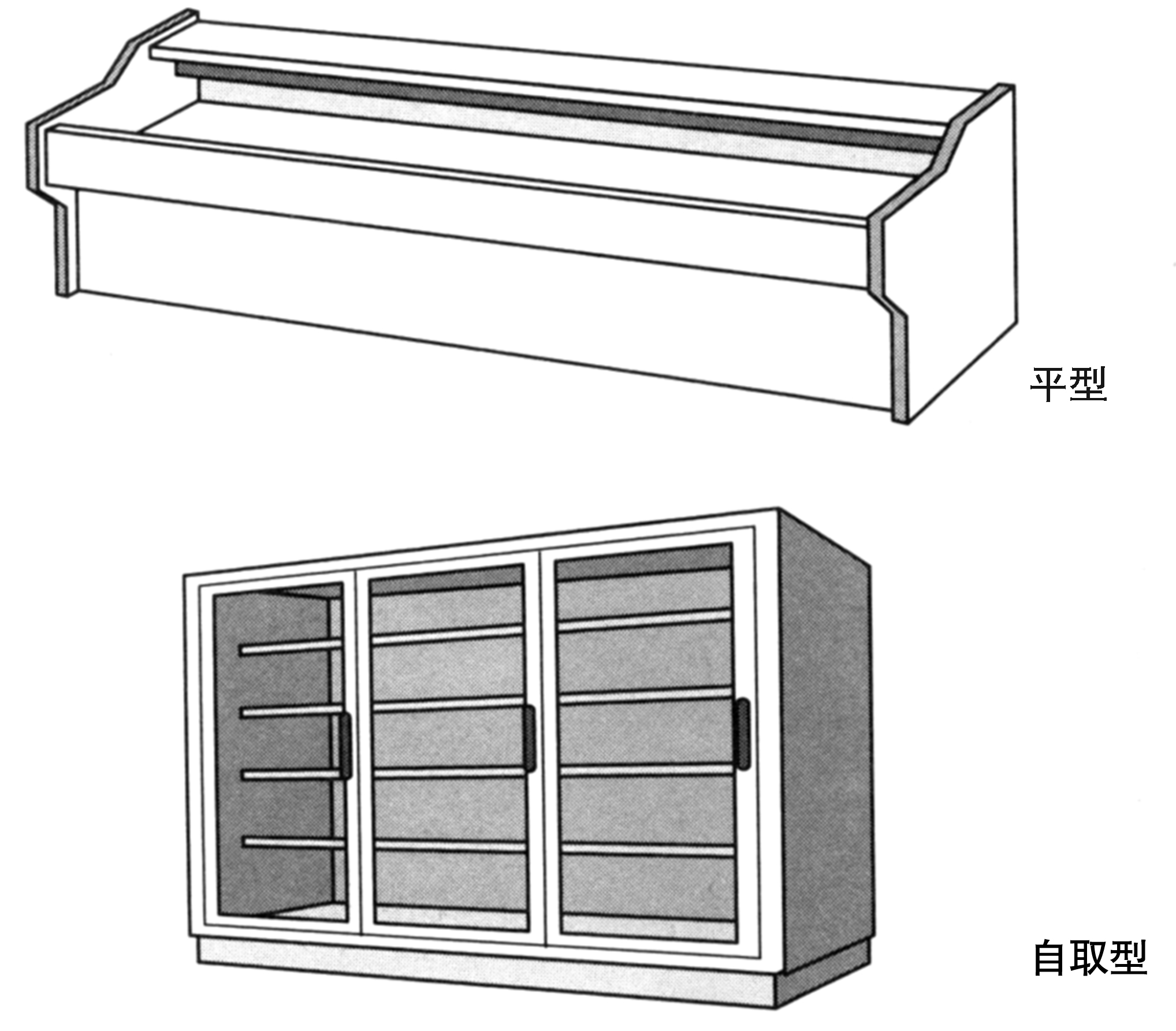 這是一種具有多層架子的類(lèi)型,有冷藏用和冷凍用兩種。在陳列蔬菜和水果的柜臺(tái)中,還有可以灑水的類(lèi)型。