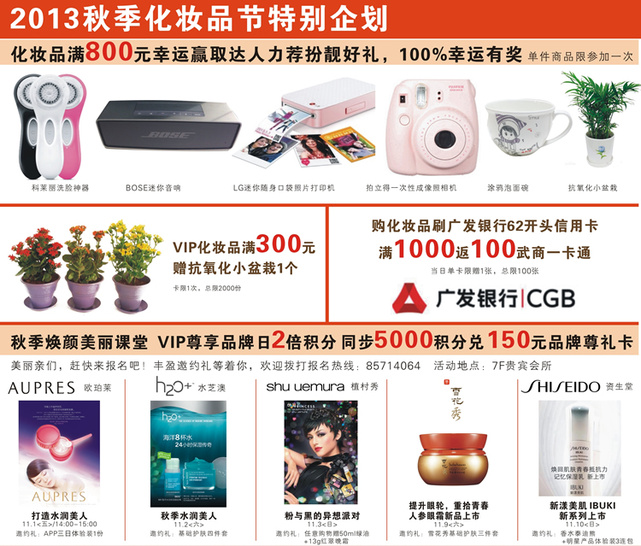 65大國際國內(nèi)化妝名品獨(dú)家禮獻(xiàn),詳情詢專柜。
