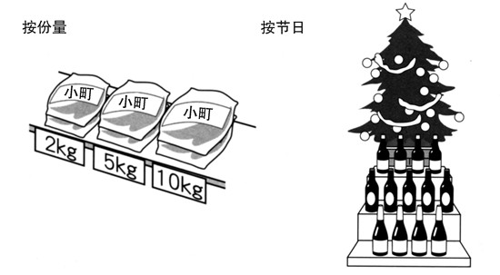 例如大米的2kg、5kg、10kg的包裝等按重量及數(shù)量進(jìn)行配置的方法。由于分量較重,應(yīng)盡量將商品陳列在收銀臺(tái)附近,以便搬運(yùn)。