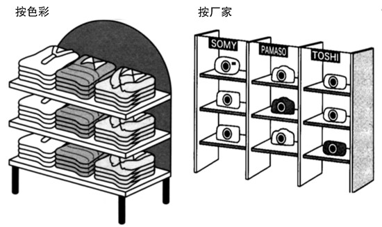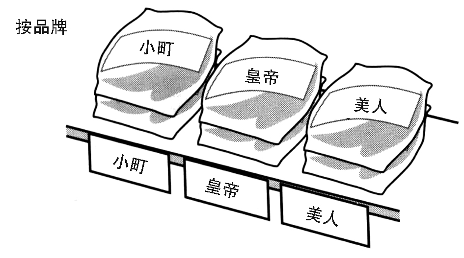 按照商品生產(chǎn)廠家進(jìn)行陳列的方法。喜歡該廠家的顧客,對(duì)該廠家的其他商品也會(huì)有所偏好。