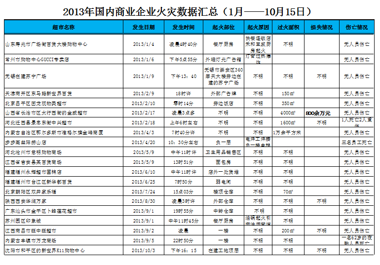 以上數(shù)據(jù)來源于國內(nèi)各大媒體公開報道,不代表作者個人觀點。出于促進國內(nèi)零售業(yè)消防安全的的發(fā)展,降低風險的目的,希望能夠引起廣大零售企業(yè)的重視!上述數(shù)據(jù),本人保證皆來自于網(wǎng)絡媒體的公開報道,有異議者,可從百度直接搜索!
