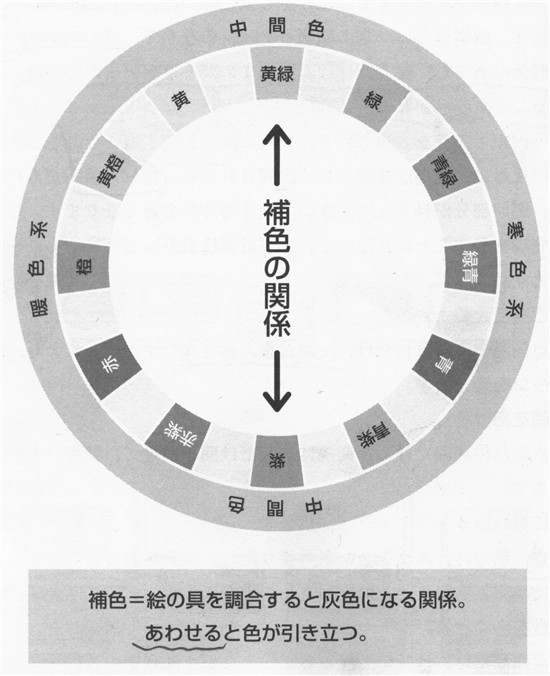經(jīng)調(diào)和后變成灰色(無彩色)的關(guān)系。用色相環(huán)觀看時(shí),兩端位置相同。
