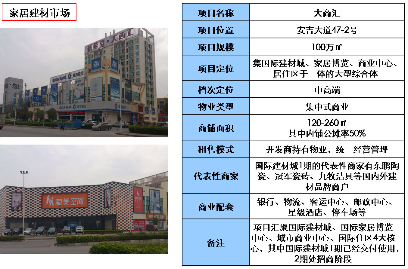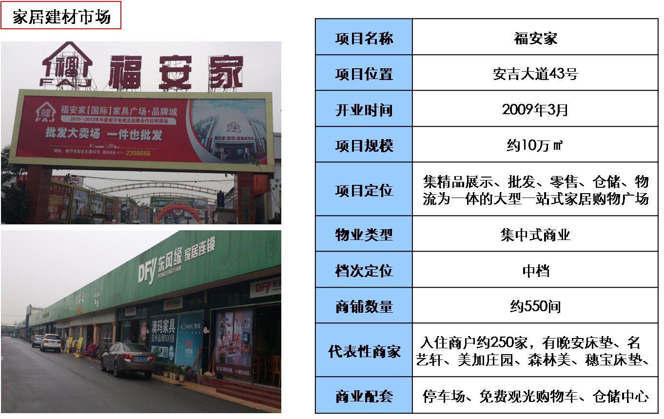 近幾年, 南寧市的家居建材市場隨著房地產(chǎn)行業(yè)的發(fā)展也蒸蒸日上,家居建材市場由最原始的街區(qū)型購物,到小型集中式商場,再到現(xiàn)在比較受歡迎的第三方運營商統(tǒng)一經(jīng)營管理的大商業(yè),如紅星美凱龍、宜家、百安居等,商業(yè)形態(tài)由單一到多樣化的發(fā)展,不僅反應(yīng)當(dāng)?shù)鼐用駥揖咏ú牡男枨笕找鏀U大,同時也突出了家居建材市場逐漸成熟這一特征。此外,家居建材的品種、品牌也逐漸多樣化,最開始只是簡單的床、桌椅、衣柜,品種、樣式、色澤都是相對單一的,隨著消費者對家居建材的需求逐漸擴大,行業(yè)內(nèi)專業(yè)技術(shù)的成熟,現(xiàn)在的家居建材市場經(jīng)營范圍已經(jīng)由單一品種擴大到家庭起居的方方面面。本文僅從安吉片區(qū)家居建材市場進行分析,希望能拋磚引玉,有興趣的朋友可以留言討論討論。