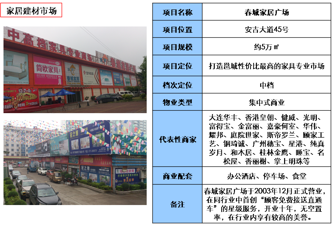 安吉片區(qū)家居建材市場:片區(qū)內(nèi)有代表性的家居建材項目有:大商匯、春城家居廣場、華凱家具城、福安家。下面逐一向大家介紹: