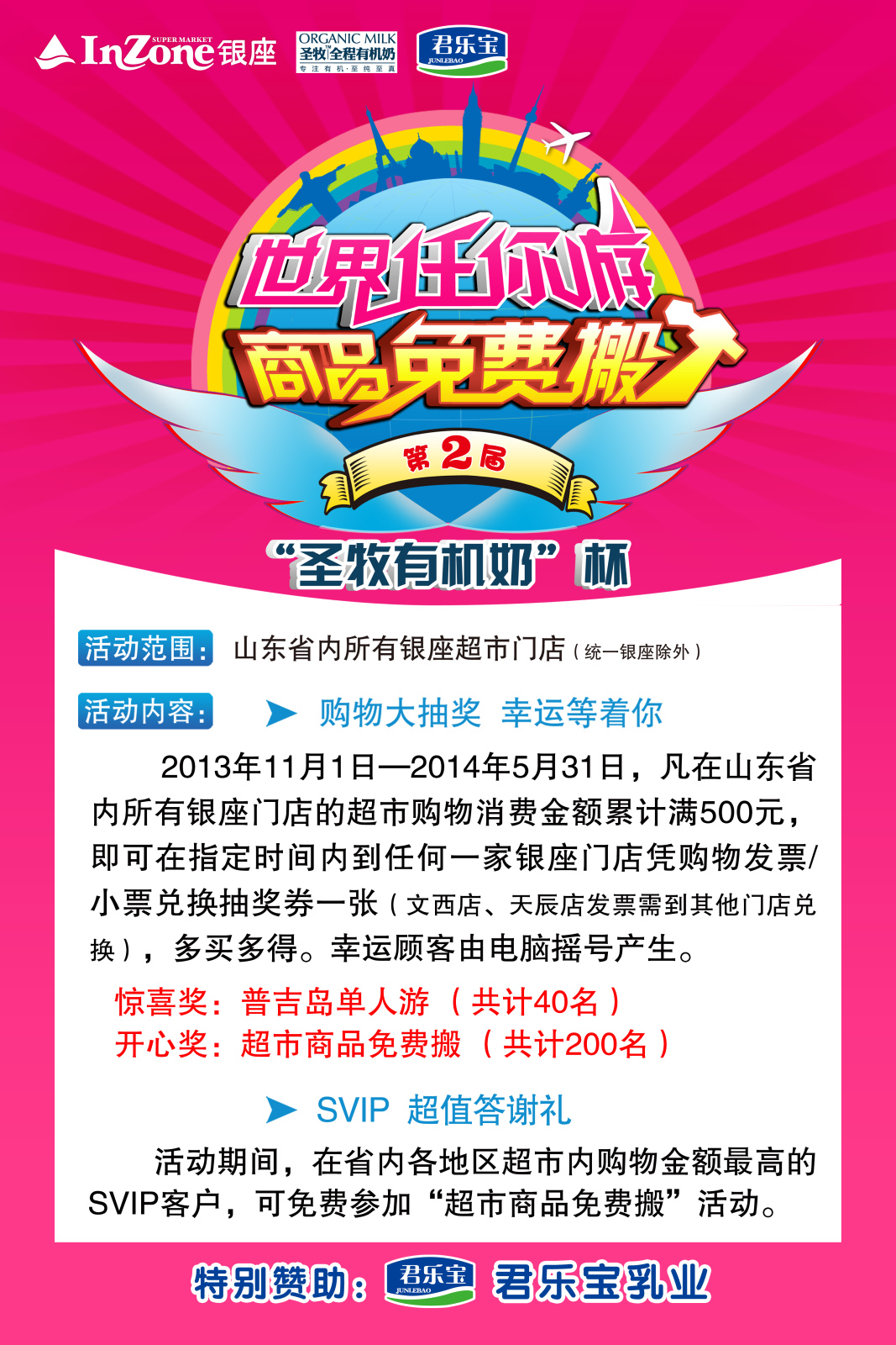 銀座超市第二屆“世界任你游、商品免費搬”活動啟動啦!2013年11月1日—2014年5月31日,在省內(nèi)所有銀座門店的超市購物消費金額累計滿500元,即可于2014年6月到銀座門店憑購物發(fā)票/小票兌換抽獎券一張,多買多得。幸運顧客由電腦搖號產(chǎn)生。驚喜獎40名,可享受普吉島單人游,領(lǐng)略迷人海島風(fēng)光;開心獎200名,可獲得“超市商品免費搬”的機會,拿取超市商品不花錢!