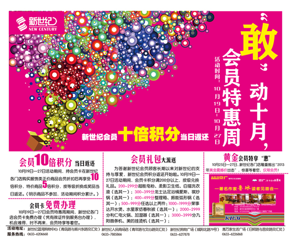 為答謝新世紀(jì)會(huì)員顧客長(zhǎng)期以來對(duì)新世紀(jì)的支持與厚愛,新世紀(jì)會(huì)員積分返還開始啦。10月19日—27日活動(dòng)期間,會(huì)員卡積分滿200分以上,按級(jí)兌換禮品。