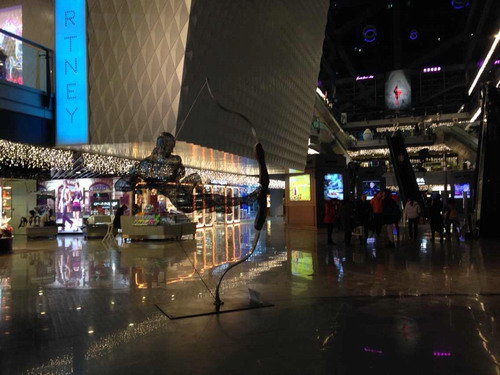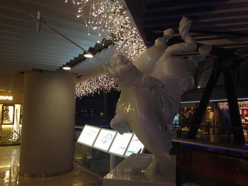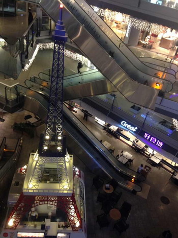 聯(lián)商網特約評論:北京僑福芳草地是我見過的購物中心里最漂亮的。 。▓D為北京僑福芳草地室內) 。ū本﹥S福芳草地大門入口旋轉門內“豬小姐”) 其藝術陳列“被鋸之鋸”,呈現(xiàn)三個鋸齒互相咬合,寓意事物間互相影響,傷害與被傷害;“開弓無箭”是空靈的;中庭的圣誕陳列是按照玩具水晶球放大幾百倍的;懸空的長橋、鋼索像電影《魔戒》城下;商場大門入口旋轉門內“豬小姐”熱情爛漫;美食區(qū)旁的斗牛藝術陳列令人震撼。