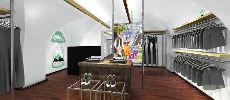 在商店內(nèi)的第一個購物區(qū)域是基于房間本身的中世紀(jì)城鎮(zhèn)建筑的拱頂進(jìn)行設(shè)計的,并參考運(yùn)用了其品牌發(fā)源地薩爾斯堡的城市建筑風(fēng)格。而用來連接不同銷售區(qū)域的走廊,被設(shè)計的像一個進(jìn)入到神秘世界的通道,用來展示兒童服裝,并在墻上用森林中的小動物作為裝飾點(diǎn)綴。