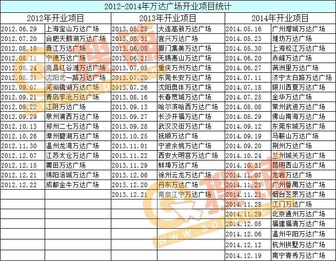 從表格中可以看出,2012年,全國(guó)有17個(gè)新開(kāi)業(yè)萬(wàn)達(dá)廣場(chǎng),2013年是18個(gè),而到2014年將達(dá)到24個(gè)。