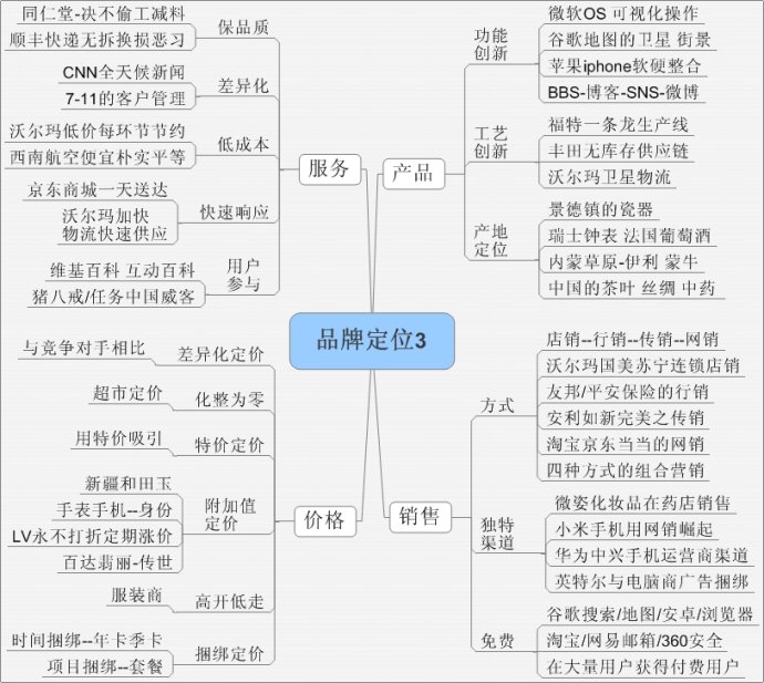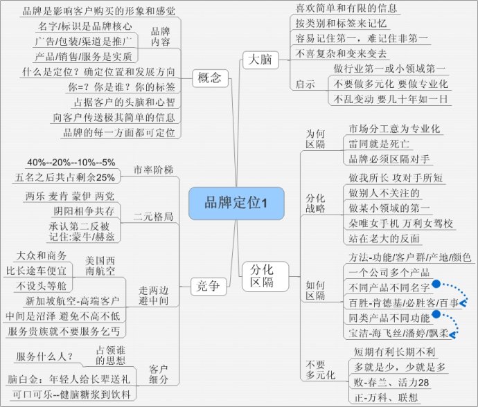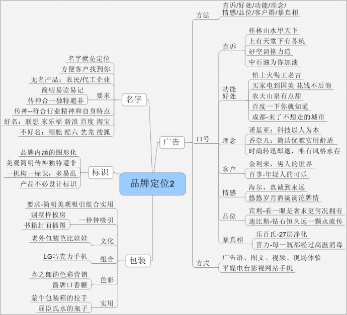 里斯·特勞特的《定位》廣為人知,孫曉岐講過(guò)的“品牌定位的12大系統(tǒng)”,但整理他們的筆記,還是感覺(jué)不夠系統(tǒng),品牌包括“名字、標(biāo)識(shí)、廣告、包裝、產(chǎn)品、銷售渠道、服務(wù)”七方面,每一方面都可以對(duì)品牌進(jìn)行定位,我按照這七方面用思維導(dǎo)圖對(duì)“品牌定位”進(jìn)行了重新梳理。