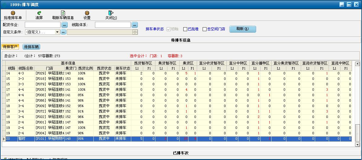 第二步:全視角展示各門店揀貨作業(yè)進度及待發(fā)容器分布,指導(dǎo)排車出車。系統(tǒng)依據(jù)門店線路體系總體展示各門店揀貨進度、各業(yè)務(wù)類型、各待裝車容器類型的分布情況,用于指導(dǎo)調(diào)度員在適當?shù)臅r間,安排適當大小的車輛進行配送。提高配送效率的同時,也大大提高了車輛的滿載率。