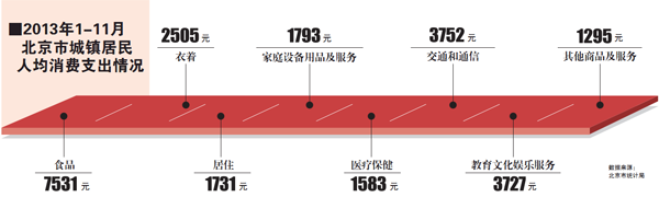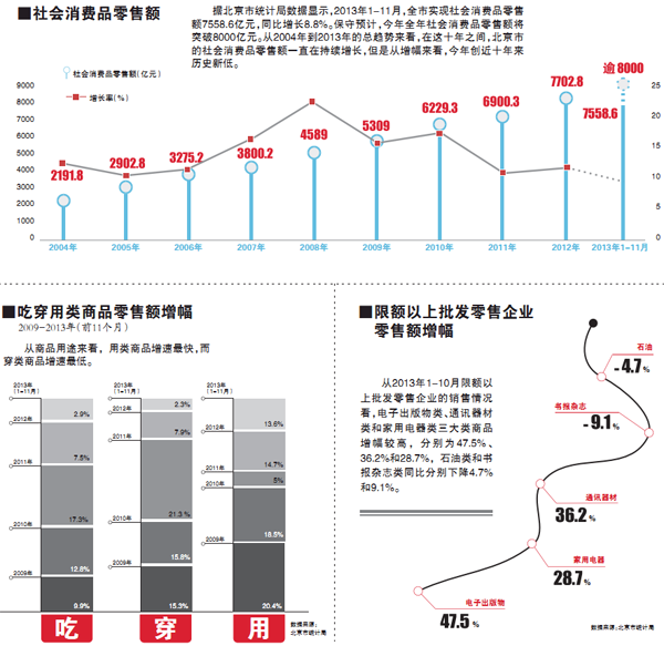 從北京市統(tǒng)計(jì)局披露的數(shù)據(jù)來(lái)看,截至2013年前11個(gè)月,北京市社會(huì)消費(fèi)品零售額已高達(dá)7558.6億元,同比增長(zhǎng)8.8%。