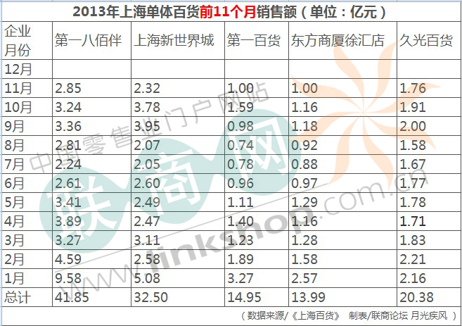 RE:2013年上海單體百貨銷(xiāo)售額 截至11月
