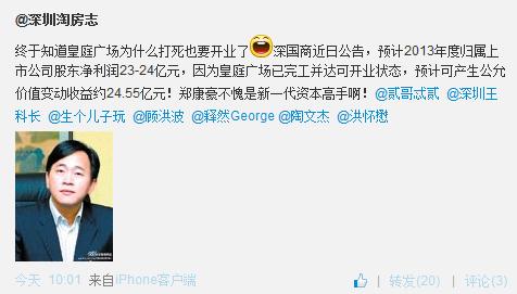 終于知道皇庭廣場為什么打死也要開業(yè)了 深國商近日公告,預(yù)計(jì)2013年度歸屬上市公司股東凈利潤23-24億元,因?yàn)榛释V場已完工并達(dá)可開業(yè)狀態(tài),預(yù)計(jì)可產(chǎn)生公允價值變動收益約24.55億元!鄭康豪不愧是新一代資本高手啊