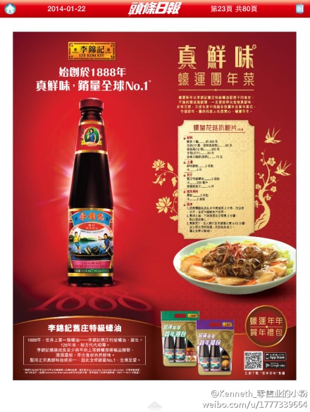 【#馬年快消#45】香港李錦記蠔油廣告。小粉點評:①悠久的歷史(1888年)②全球銷量第一(來自Euromonitor數(shù)據(jù))③賀年禮包為兩瓶蠔油 ④除了廣告有賀年菜譜,還有App 下載食譜, 更年輕化!